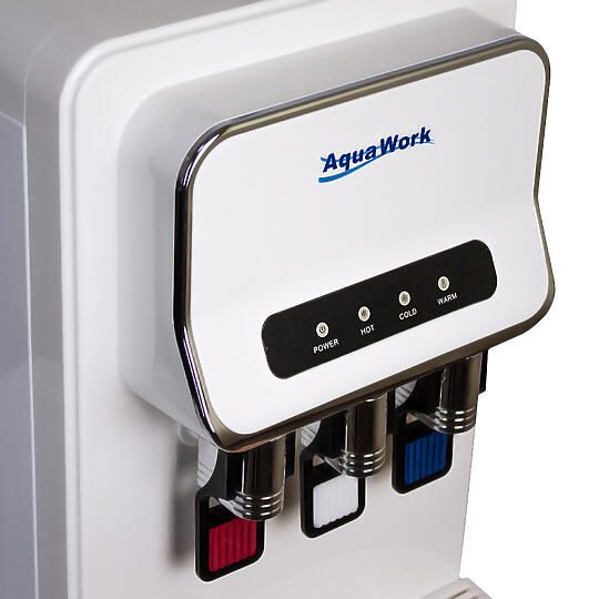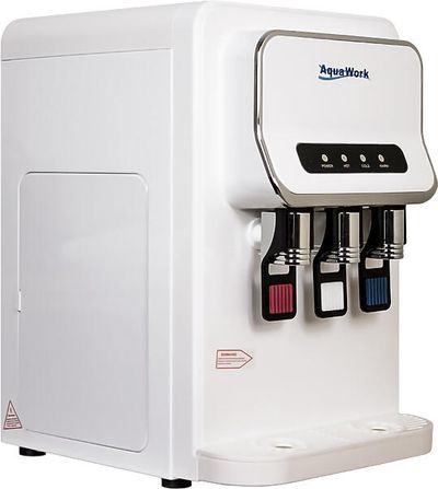 Небольшой настольный проточный кулер-пурифайер Aqua Work D93-WE с нагревом и электронным охлаждением воды. Очищает водопроводную воду при помощи системы UF-фильтрации.
