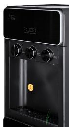 Необычный внешний вид кранов, стильный корпус полностью черного цвета и нижний отсек, в котором полностью скрывается бутыль, позволяют эффектно вписать этот кулер в современный интерьер с продуманным дизайном.