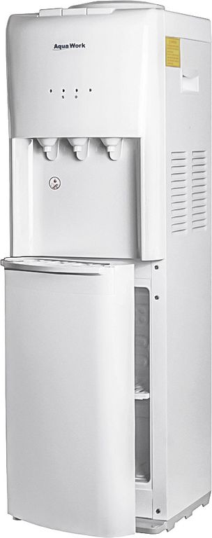 Белый напольный кулер для воды Aqua Work 1345-S-B с нагревом, компрессорным охлаждением, небольшой встроенной холодильной камерой и дополнительными опциями "вода комнатной температуры" и "защита детей от ожогов".