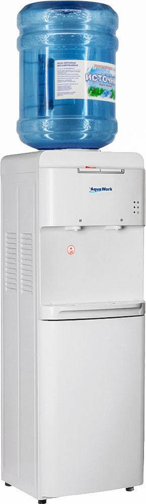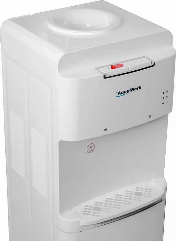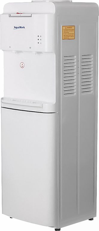 Белоснежный напольный диспенсер Aqua Work 1536-S с нагревом, компрессорным охлаждением и защитой от случайного нажатия на "горячей" кнопке.