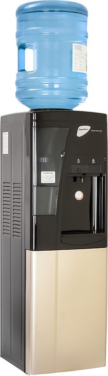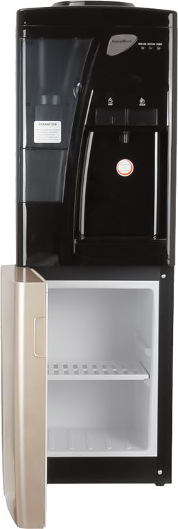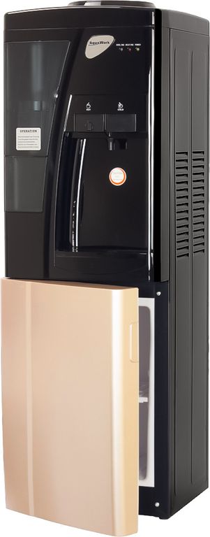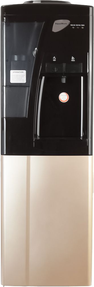 Напольный кулер для воды Aqua Work 3-W с нагревом, электронным охлаждением, встроенным шкафчиком на 16 литров и небольшим стаканодержателем.