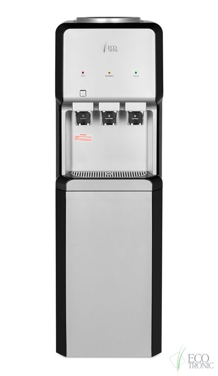 Напольный кулер с электронным охлаждением и шкафчиком в нижней части. Три крана типа "нажим кружкой" для подачи воды (горячая/комнатной температуры/холодная). Защита на кране горячей воды. Корпус серебристого цвета с черным декором на передней панели. В верхней части расположены индикаторы нагрева, охлаждения и готовности к работе третьего крана.