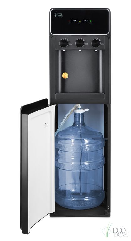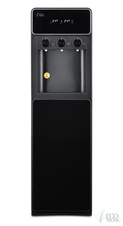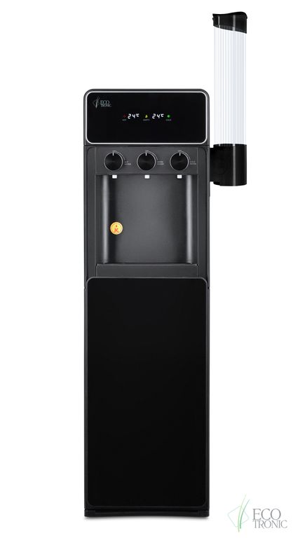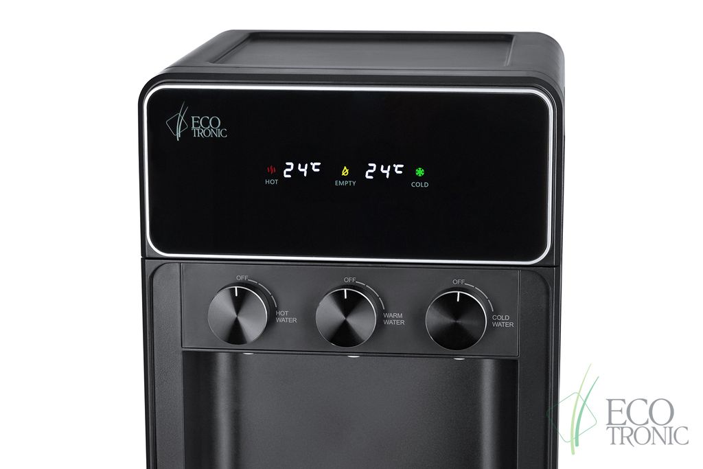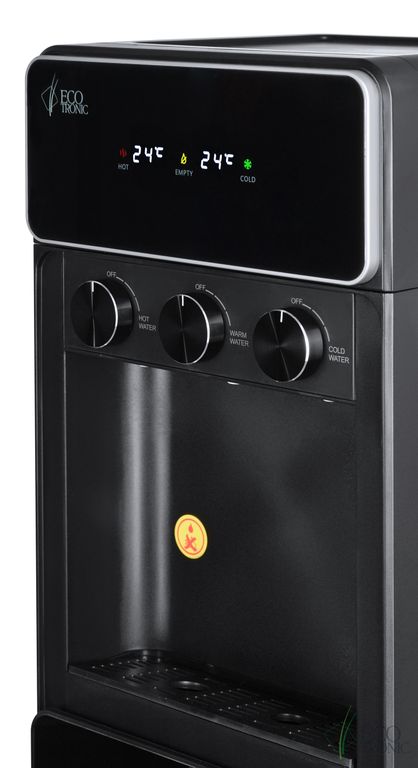 Необычный внешний вид кранов, стильный корпус полностью черного цвета и нижний отсек, в котором полностью скрывается бутыль, позволяют эффектно вписать этот кулер в современный интерьер с продуманным дизайном. В верхней части расположен экран с визуальным отображением температуры нагрева и охлаждения воды.