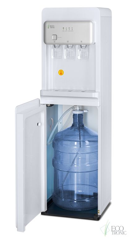 Эффектный дизайн позволяет вписать кулер в интерьер современного офиса: бутыль с водой полностью скрыта в нижнем отсеке, дверца которого имеет глянцевую стеклянную поверхность. Корпус белого цвета с серебристыми вставками на передней панели.