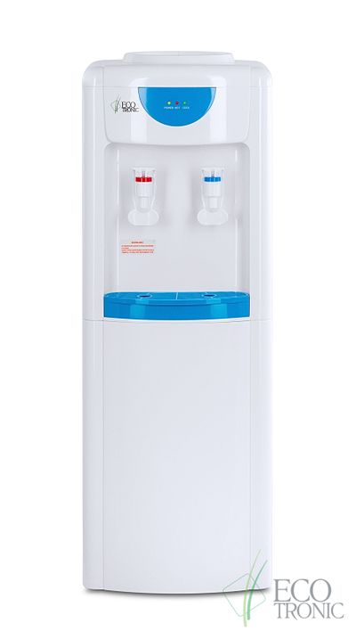 Компактный напольный кулер с электронным охлаждением. Бюджетный вариант со всеми необходимыми функциями. Корпус белого цвета с голубыми вставками. Индикация режимов нагрева, охлаждения и готовности воды. Краны «нажим кружкой»
