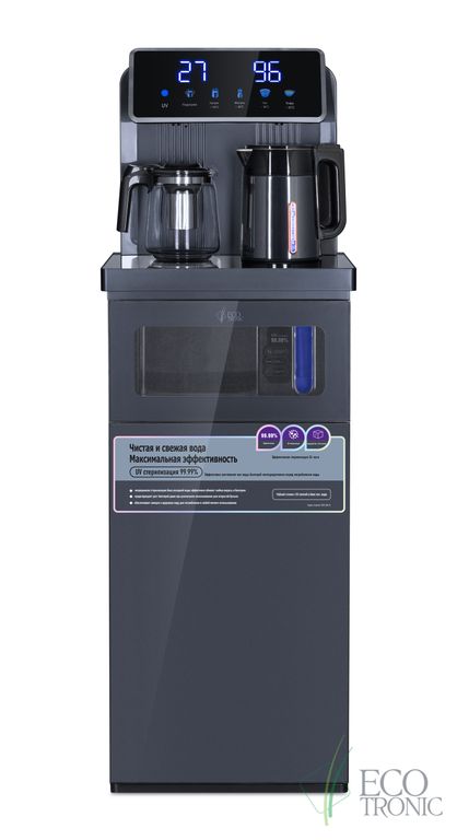 Тиабар Ecotronic TB33-LNR с UV-лампой в накопительном баке— это напольный кулер с чайным столиком без охлаждения. Основные функции: дезинфекция непосредственно при подаче воды, нагрев и подача воды комнатной температуры. Нагрев воды в чайнике до 100°С. В верхней части шкафчик для храненияБольшая и удобная панель управления с возможностью задать температуру нагрева (4 режима нагрева). Пульт дистанционного управления. Нижняя загрузка бутыли. Два чайника — для кипячения и заварочный. Чайник кипячения внутри выполнен из цельнотянутой нержавеющей стали, а снаружи имеет индикацию при нагреваниим Функция стерилизации воды ультрафиолетом: в верхней части корпуса расположен накопительный бак на 2 л с установленной в нем UV-лампой