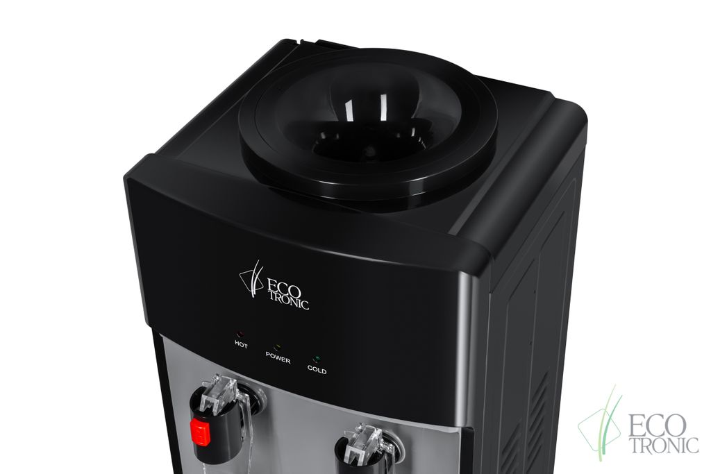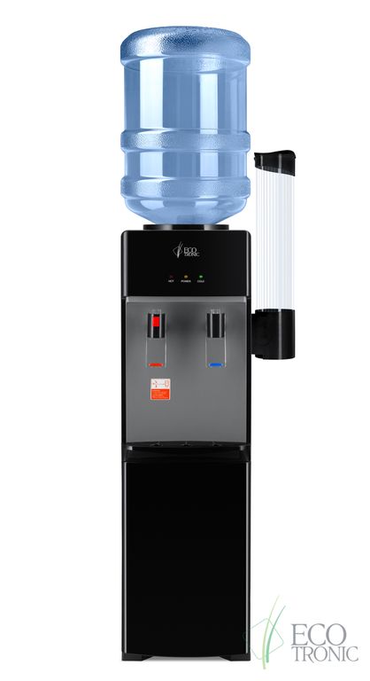 Напольный кулер с электронным охлаждением стандартного (от 90 до 105см) типоразмера. Краны «нажим кружкой», защита от случайного нажатия на кране горячей воды. Корпус чёрного цвета с акцентной серой вставкой в области подачи воды. Возможность жесткого крепления к полу для защиты от падения. Индикаторы нагрева и охлаждения в верхней части передней панели