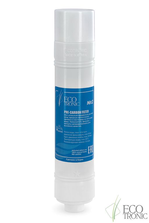 Фильтр #2 Ecotronic Pre-carbon 12”. U-type. Угольный пре-фильтр. Пр-во Юж. Корея. Размер 12 дюймов. Ресурс 3000 - 10000 литров в зависимости от качества исходной воды. Рекомендуемая замена: 6 месяцев. Имеет выходы для быстрого соединения типа цанга-цанга. Может использоваться в любых моделях пурифайеров Ecotronic.