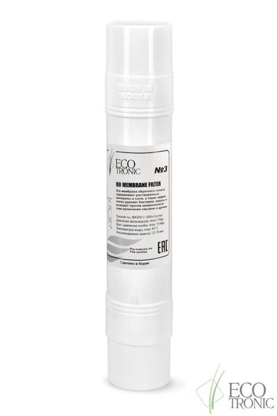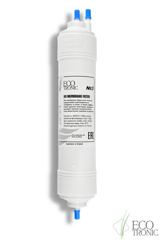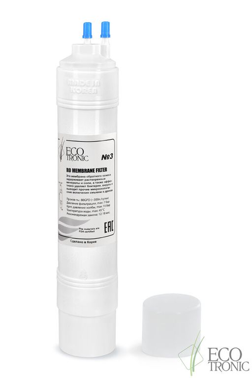 Фильтр #3 Ecotronic RO 80GPD 14”. Мембрана обратного осмоса. Пр-во Юж. Корея. Размер 14 дюймов. Ресурс до 8000л., но не более 12 месяцев. Имеет выходы для быстрого соединения типа цанга-цанга.