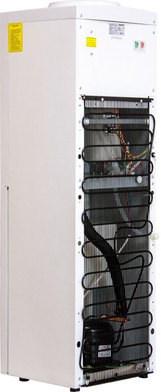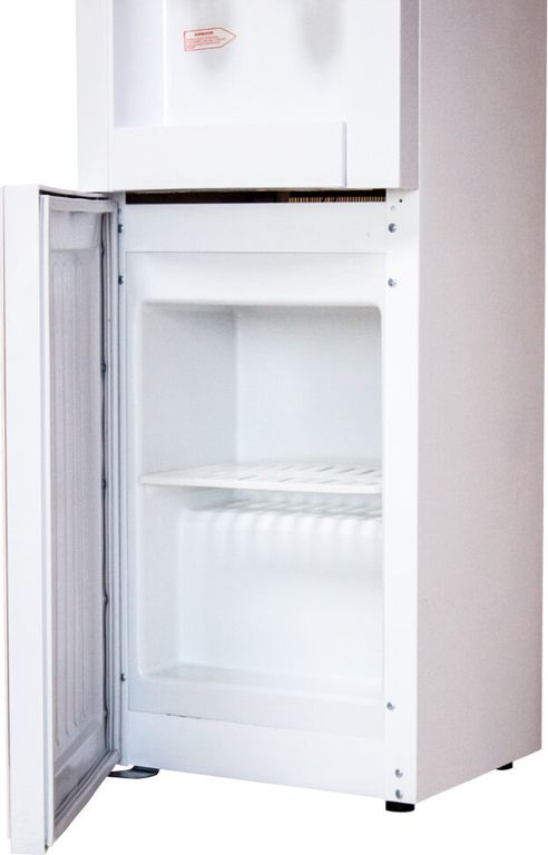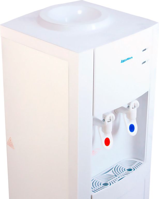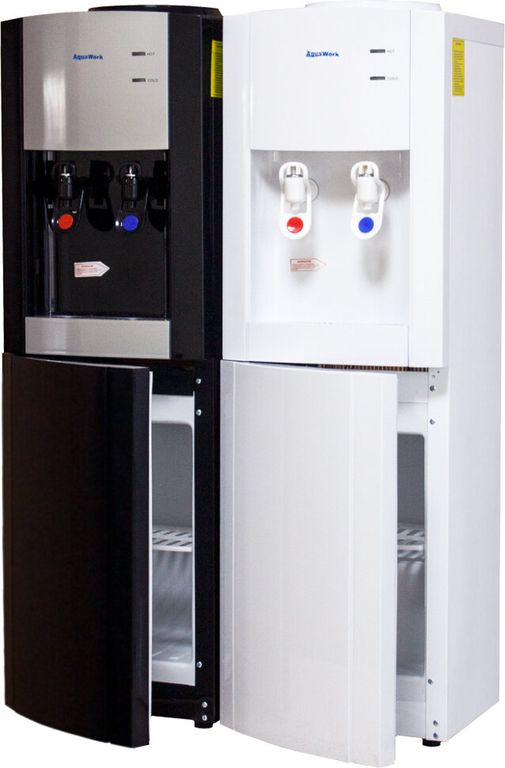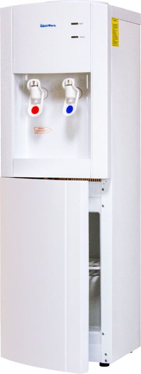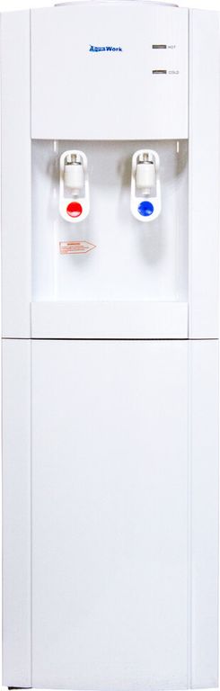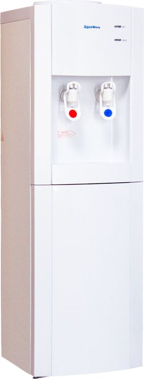Напольный кулер для воды Aqua Work V901 с нагревом, компрессорным охлаждением, белым стальным корпусом и миниатюрным шкафчиком.