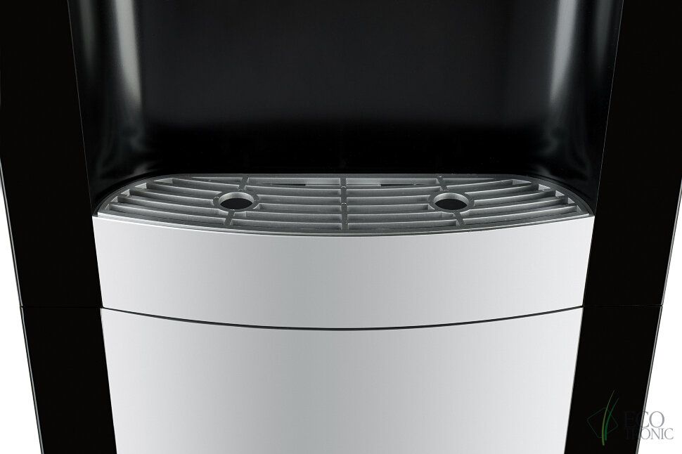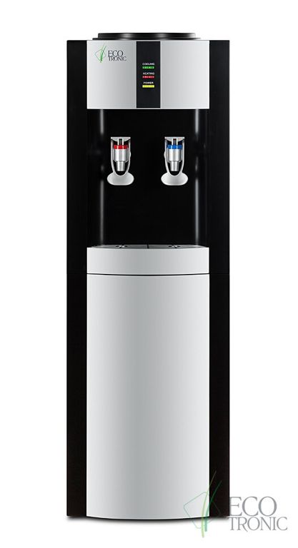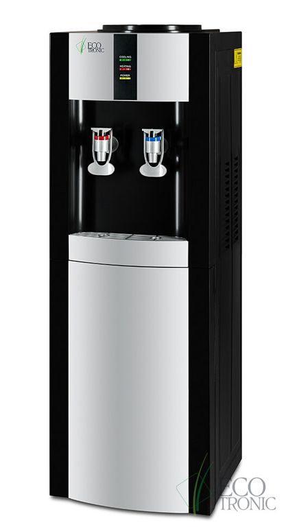 Кулер Ecotronic H1-LF Black. Напольный кулер черного цвета с серебряной вставкой и с компрессорным охлаждением. С холодильником. Тип кранов подачи воды - "Нажим кружкой".