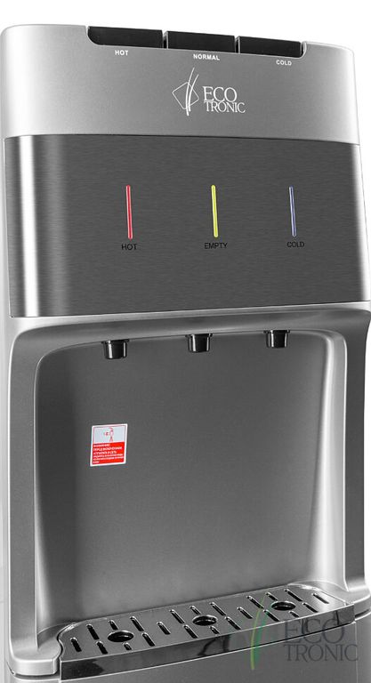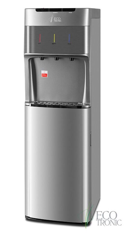 Кулер с нижней загрузкой бутыли и электронным охлаждением. Корпус серебристого цвета со вставкой из нержавеющей стали. 3 клавиши подачи воды (горячая/комнатной температуры/холодная). Клавиша горячей воды с защитой от детей. Индикация режимов нагрева, охлаждения воды, а также индикация отсутствия воды в бутыли. Для быстрой очистки краников применяются съемные гигиенические колпачки. Выключатели нагрева и охлаждения воды.