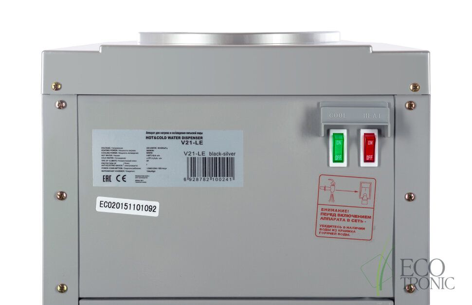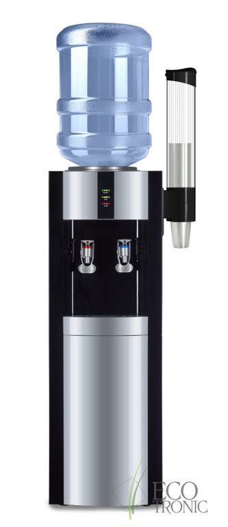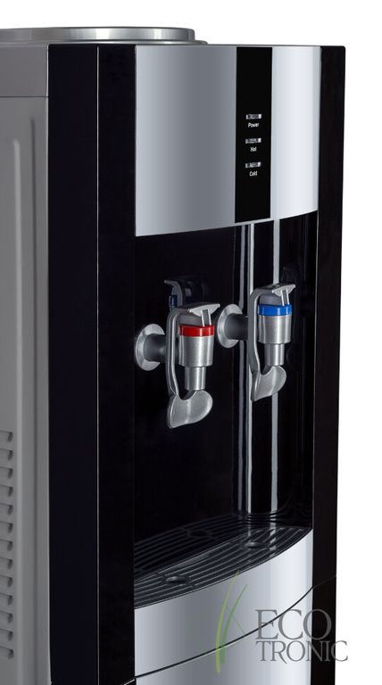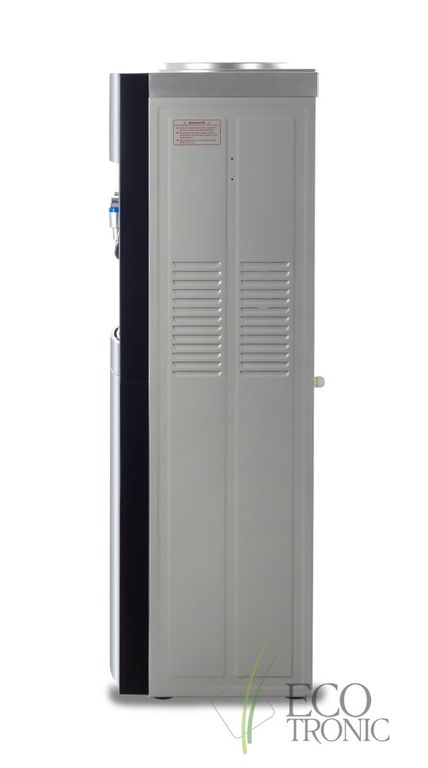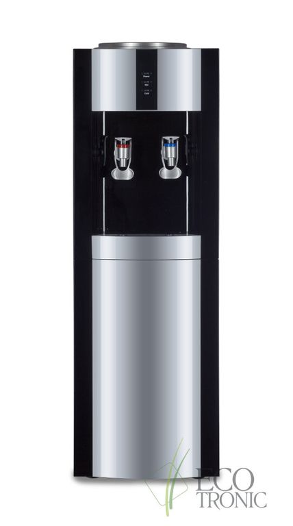 Кулер "Экочип" V21-LE black-silver. Бюджетный аналог классической модели Ecotronic H1-LE v.2. Напольный кулер с электронным охлаждением.Тип кранов подачи воды - "Нажим кружкой". Одинарный блок охлаждения.