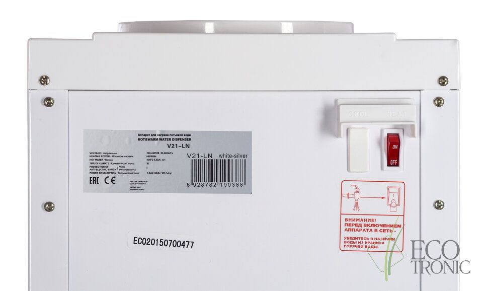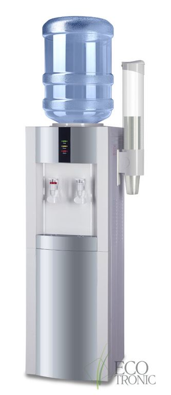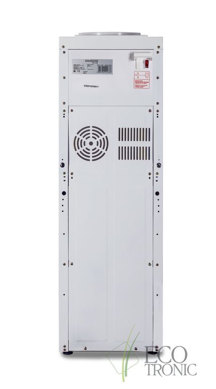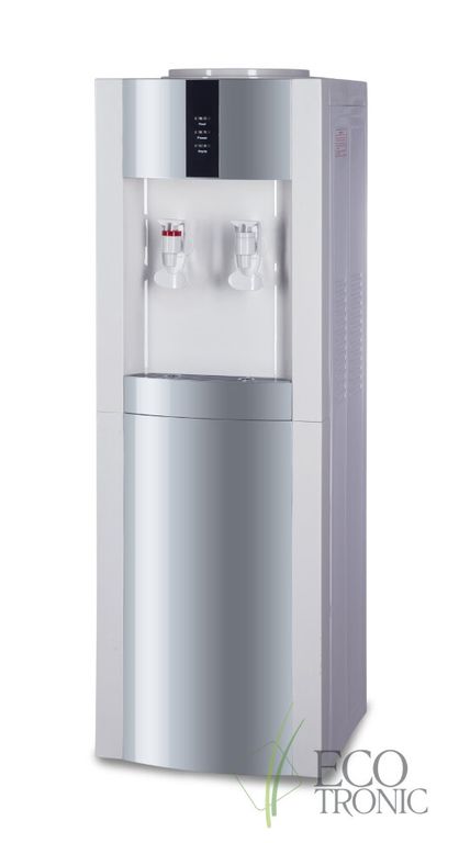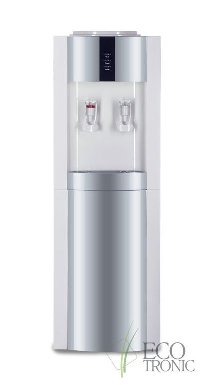 Кулер "Экочип" V21-LN white+silver. Бюджетный аналог классической модели Ecotronic Н1. Напольный кулер Без охлаждения. Цвет белый с серебристой вставкой. Тип кранов подачи воды - "Нажим кружкой". Бак нагрева 1,1 л неразборый.