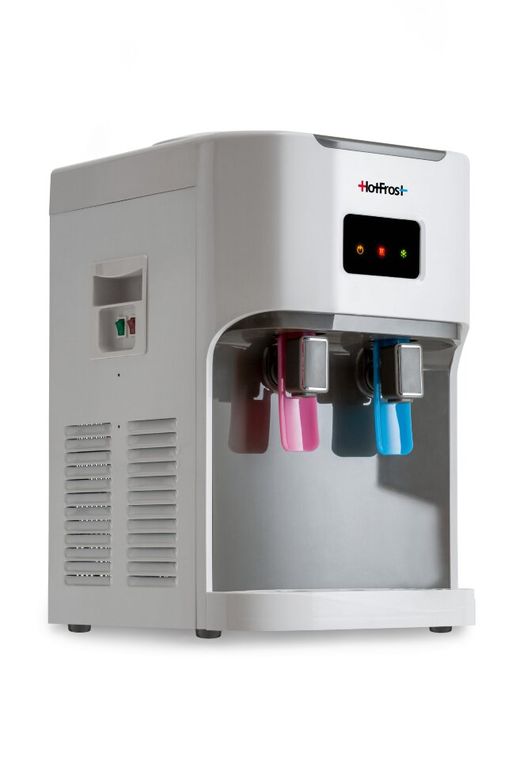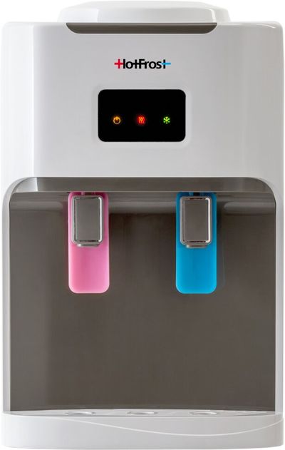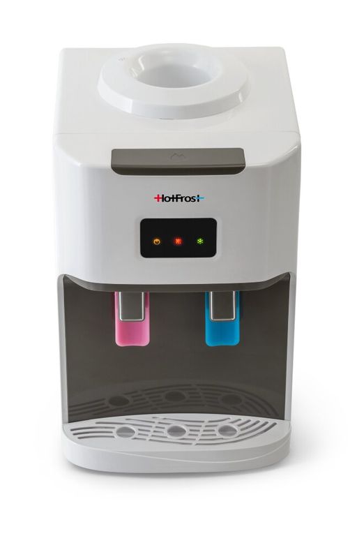 Компактный настольный кулер для воды с функциями нагрева и охлаждения. С верхней загрузкой бутыли. Компрессорное охлаждение. Краны «нажим кружкой».