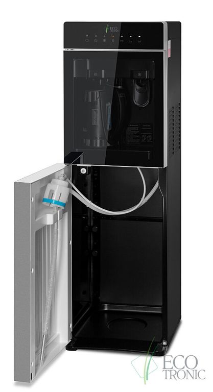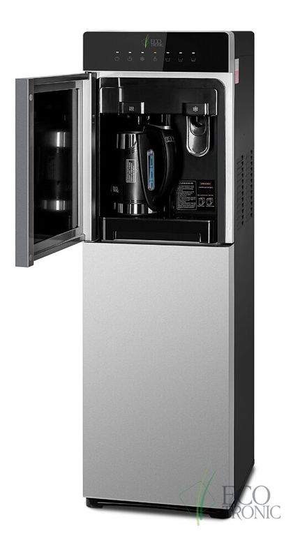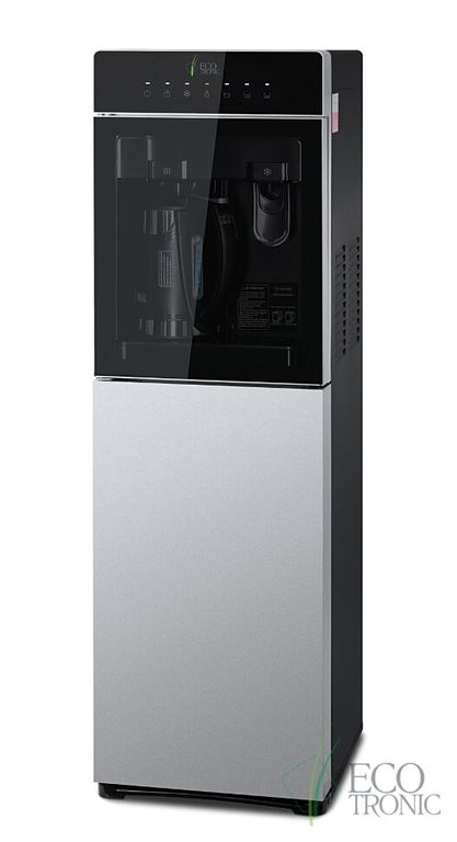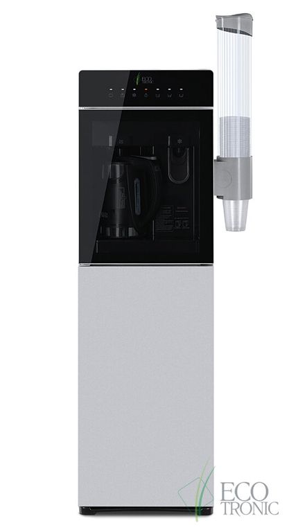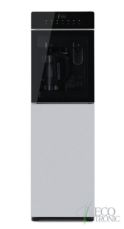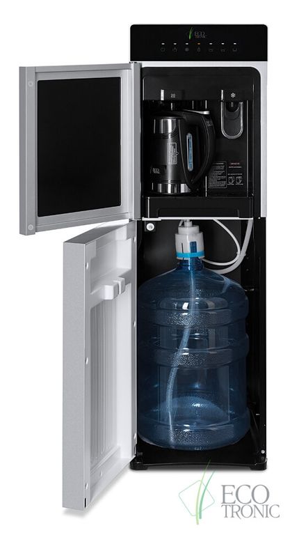 Кулер Ecotronic M15-LXKEM с ЧАЙНИКОМ! Аппарат с нижней загрузкой бутыли, электронное охлаждение. Цвет корпуса: черный с серебряной вставкой. Особенность аппарата, встроенный литровый чайник! Горячая вода нагревается в чайнике,а объем наливаемой воды, регулируется кнопками на передней панели. Разливать горячую воду, так же можно только из чайника! Холодная вода набирается из крана (кран – нажим кружкой). Преимуществом аппарата, является высокая производительность нагрева горячей воды, до 9 литров в час! Температура нагрева воды достигает 99С! Панель управления с возможностью отключения нагрева и/или охлаждения воды. Индикация режимов нагрева/охлаждения и отсутствия воды в бутыли. Тихая работа водяного насоса. Защита от протечек. В боковых панелях имеются отверстия под крепления держателей для стаканов.