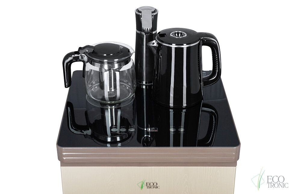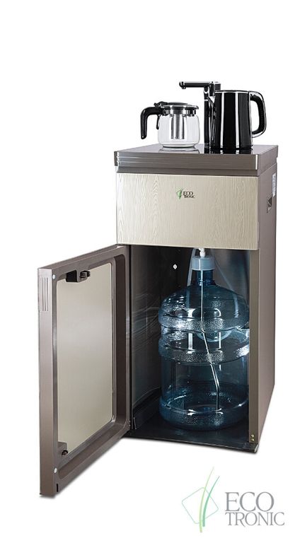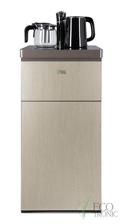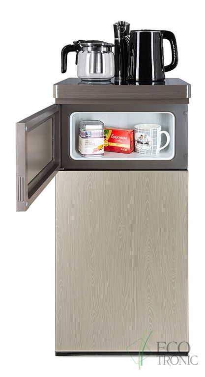 Тиабар Ecotronic TB7-LE gold – это напольный кулер с чайным столиком. Нижняя загрузка бутыли, электронное охлаждение. Два чайника – для кипячения (изотермический) и заварочный. Нагрев воды в чайнике до 100°С. Шкафчик для хранения.