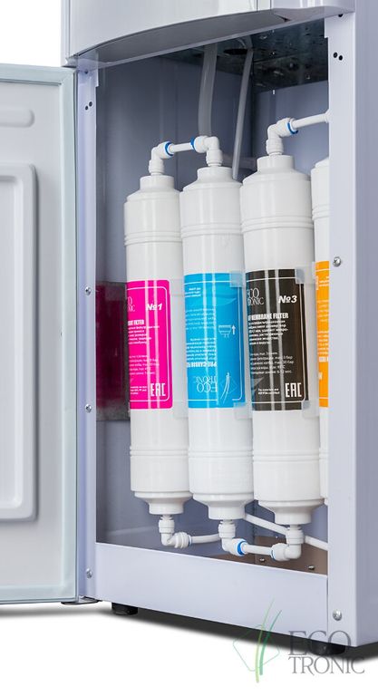 Пурифайер Ecotronic H1-U4LE white-silver с ультрафильтрацией. Электронное охлаждение. 4-х ступенчатая система очистки. Краны подачи воды "нажим кружкой". бак гв 1.2л., бак хв 4л. Внешний тэн нагрева.