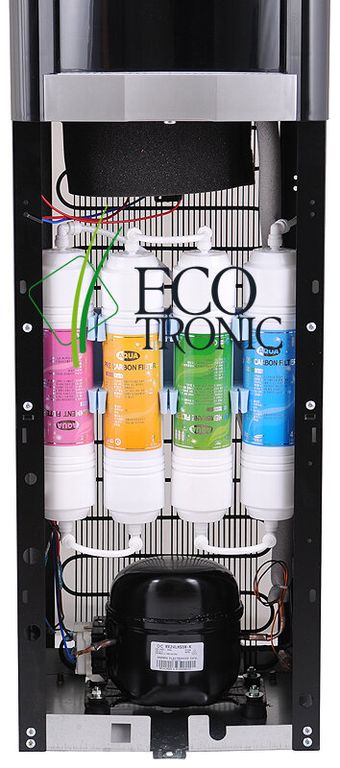 Пурифайер Ecotronic V40-U4L Black - черный с серебристой передней вставкой. Аппарат с 4-х ступенчатой UF фильтрацией с увеличенным баком горячей воды 5л, холодной воды 6,2л., и мощностью нагрева 1000Вт. Производство Юж.Корея.