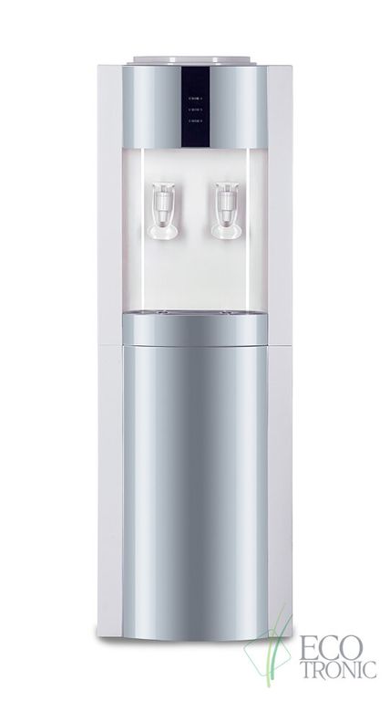 Раздатчик воды "Экочип" V21-LWD white+silver. Бюджетный вариант напольного раздатчика воды, без нагрева и охлаждения. Цвет белый с серебристой вставкой. Тип кранов подачи воды - "Нажим кружкой".